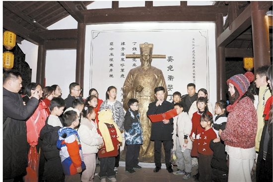 接着,胡公书院少儿班的学员们在“为官一任、造福一方”的照壁前,朗诵胡联章新创作的《胡公故事诗词》《天门立志》《担薪苦读》《三保庄田》《改革盐法》《立训启后》等诗篇,将胡公的初心与担当、勤政与为民,化作朗朗诗行,学员们的朗诵声在祠殿中久久回响。