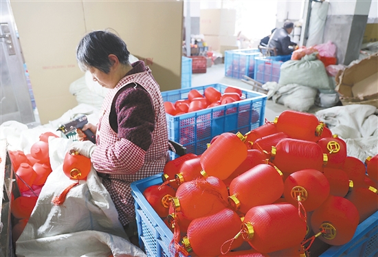 1月4日,在石柱镇洪福村湖塘自然村的一家灯笼厂内,工人们熟练地加工各式红灯笼,应对春节前订单高峰。