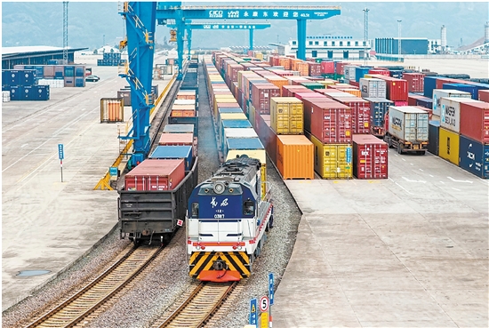 1月4日,浙江交通集团永康东站海铁联运集装箱区内一派繁忙景象,卡车往来穿梭、龙门吊有序作业,一个个满载货物的集装箱整齐排列,等待发往宁波舟山港。元旦期间,共开行海铁班列6列,发送出口集装箱货物近520标箱,同比增长4%,以强劲势头火热开局。 融媒记者 杨成栋 摄