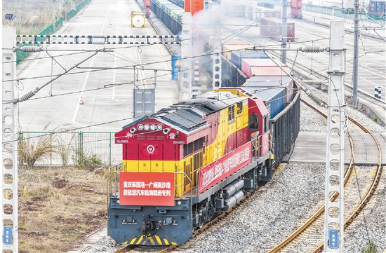 1月7日,一列满载108台“重庆造”新能源汽车的铁海联运专列,从重庆果园港鱼嘴站发出,预计在48小时后抵达广州南沙港,随后换装海轮运往中东市场。此趟专列是2026年首趟铁海联运“重庆造”新能源汽车专列,也是自2025年12月底渝穗两地“新能源汽车铁海联运海事监管互认试点”正式启动以来进行的首批规模化运输业务。 新华社记者 唐奕 摄
