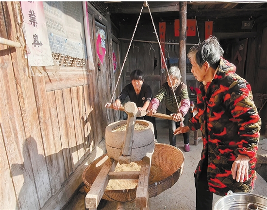 1月12日,唐先镇唐上村里年味渐浓。村民潘莲富熟练地推磨制作传统美食——  。在当地习俗中,出嫁女年前要带 回娘家。它既是一份饱含情意的年礼,也是代代延续着的团圆味道。