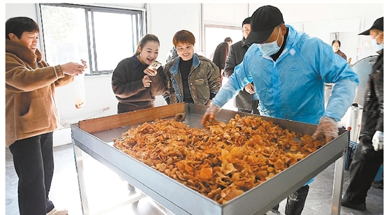 1月15日,在三川共富工坊里,一口大锅里滚烫的热油散发着诱人香气。去皮洗净的番薯、土豆等农产品,经过切片机加工成均匀薄片后,倒进锅中油炸。待油炸好的番薯片、土豆片冷却后,工人们便熟练地进行称重、打包装袋。