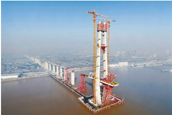 1月16日,在浙江杭州湾海盐侧离岸约0.4公里的海面上,由上海国铁建管公司建设管理、中铁大桥局承建的北航道桥高达200米的8号主塔成功封顶。这是大桥全线三座航道桥、七座主塔中首座封顶的主塔,标志着这一超级工程建设取得重大阶段性进展。 新华社记者 黄宗治 摄