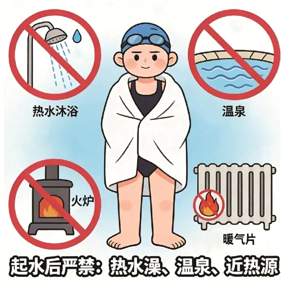 刘芳特别提醒,起水后千万别立即冲热水澡、泡温泉,也不要靠近火炉、暖气片猛烤。“这会导致外周血管瞬间急剧扩张,引发‘回暖性低血压’,造成心脏、大脑等重要器官供血急剧减少,轻则头晕眼花,重则脑部缺血、当场晕厥,风险极高。”