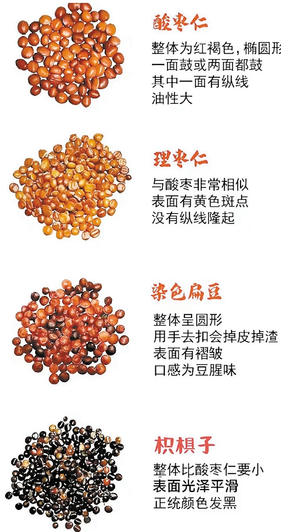 市面常见的酸枣仁伪品,多以同科属植物的种子冒充,如理枣仁、枳椇子,也有部分经过染色、增重处理的劣质品,根据其鉴别特征区分。