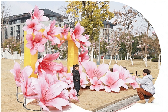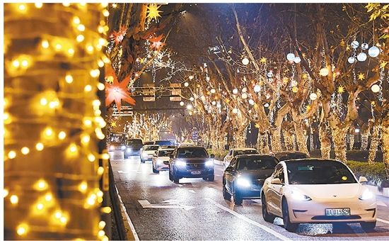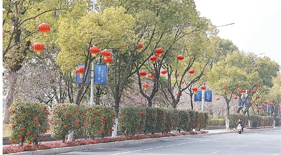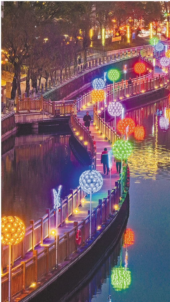 夜幕降临时,漫步城区金城路,处处“火树银花”。一串串灯笼高高悬挂在枝头,一圈圈灯带绕着树干,似点点繁星自夜空垂落,在冬日的寒意中跃动着温暖而活力的光彩,率先奏响了新春的序曲。