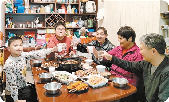 今年,武绍春依旧没有回家过年,独自一人留永。他的朋友童步高得知后,就邀请他一起吃年夜饭。不一会儿,一桌色香味俱全的家常菜就摆满了餐桌。大家围坐在一起,共同举杯庆祝新年,看着春晚、聊着生活,童步高的两个孙子在一旁嬉笑玩耍,欢声笑语填满了整个屋子。