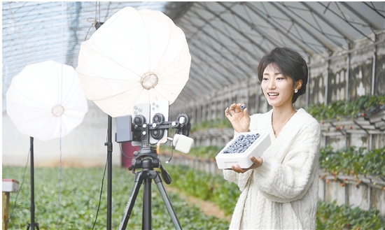 2月26日,在北京市平谷区山东庄镇鱼子山村一处设施农业基地的大棚内,工作人员直播销售蓝莓。近日,山东庄镇种植的大棚蓝莓陆续进入成熟期,工作人员加强管理,适时采收蓝莓,在供应市场的同时,通过视频直播、游客采摘等方式,多措并举助力蓝莓销售。 新华社记者 任超 摄