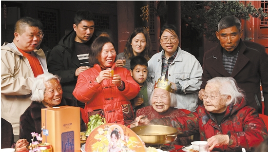 “妈,祝你生日快乐!”近日,西城街道排塘村的祠堂内热闹非凡,百岁老人周娇云被子孙们簇拥着坐到正中,她穿着暗红色的新衣裳,银发一丝不乱。院子里挂满了寿联和红灯笼——这一天,是周娇云老人的百岁寿诞,家人从四面八方赶回来,给她热热闹闹地过了个生日。