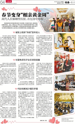 多位受访者表示,曾遭遇父母千方百计的相亲安排,而在阖家团圆的春节期间,有的父母还会采用“恋爱代理人”的方式,即通过亲友迂回接近,试图让子女在亲朋舆论压力下改善对相亲的态度。“春节走亲戚拜年少不了提起情感话题,亲戚一般不会直接提相亲,总是从年龄问起。一听到这话,我就要打起十二分的精神应对。”一位受访者说,这种委婉的试探带来无形压力的同时,也让本该轻松的家庭聚会氛围变得压抑。