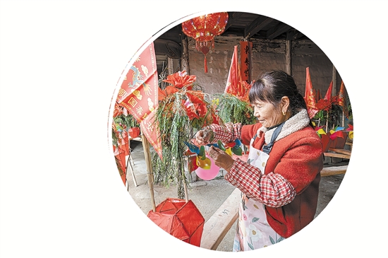 西城街道山下村龙灯历经两百年的传承,因其精彩绝伦且技艺高超的盘灯表演,被誉为“灯中武魁”。这尊龙头以传统纸扎工艺扎制而成,造型立体而饱满。通体以正红彩纸为底,层层粘贴的纸片模拟出嶙峋的鳞甲与褶皱的肌理,质感厚实。最独特的是其装饰,龙角与眉骨处遍插姹紫嫣红的绢花,疏密有致,宛若一顶华丽的花冠。下颚处悬挂着黑白相间的流苏,如同遒劲的龙须,与周身的喜庆红火形成强烈对比。