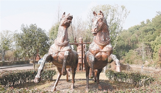 沿着游步道,走进东城街道九洲村车马何自然村,首先映入眼帘是两匹马拉车的雕塑。这座雕塑就是村名由来的传说。