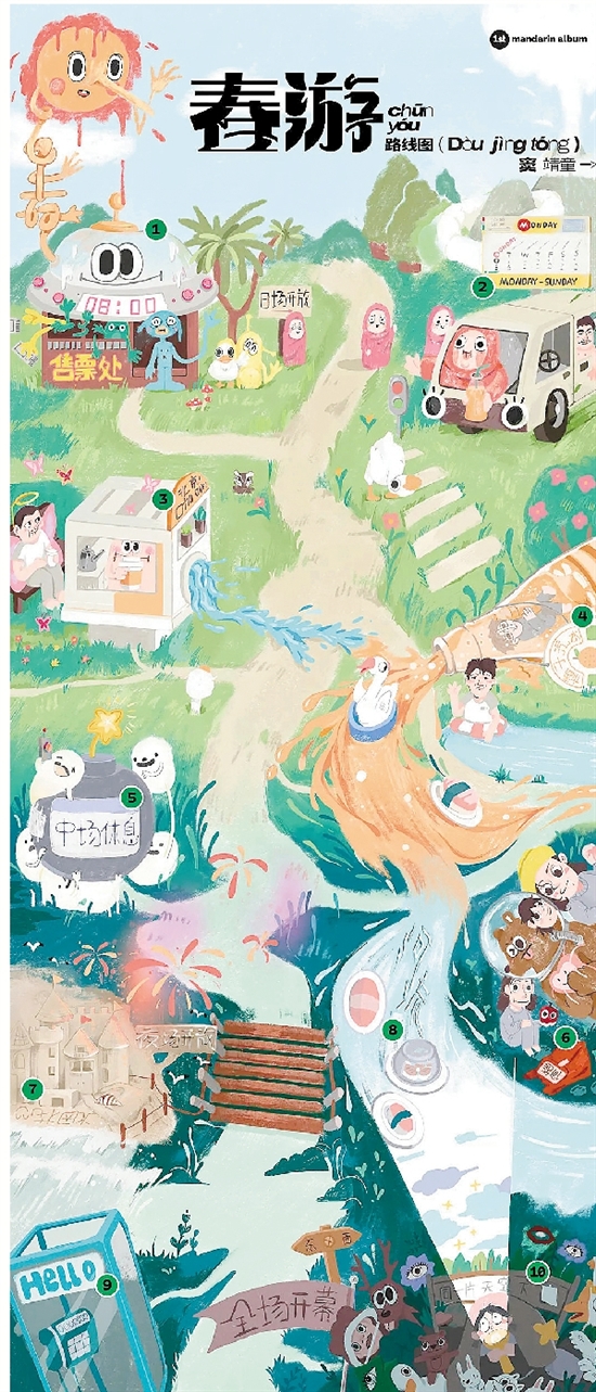 专辑中布满了窦靖童所擅长的“实验”元素,充满千禧感的Jazz-Pop(爵士流行)、迷幻的Trip-Hop(神游舞曲)、8Bit电子合成器等,配器中也使用了打击乐、小号甚至口哨声和猫叫的采样。整张专辑风格前一半明媚慵懒,后一半空灵迷幻,风格明晰地划分出这场春游的“日场”和“夜场”区域,中插《中场休息》一曲,实现了专辑概念策划。