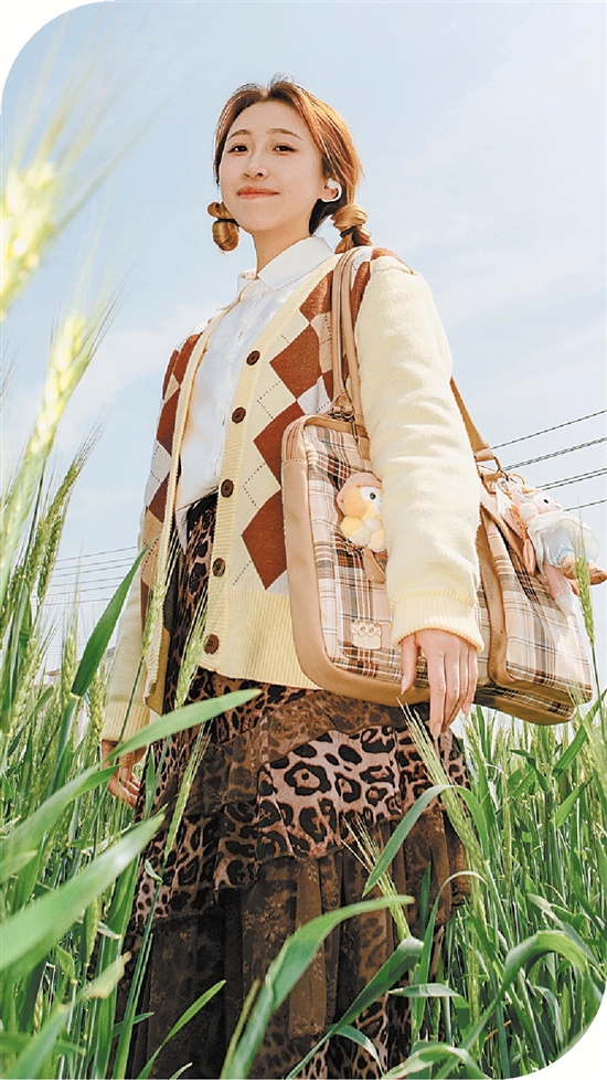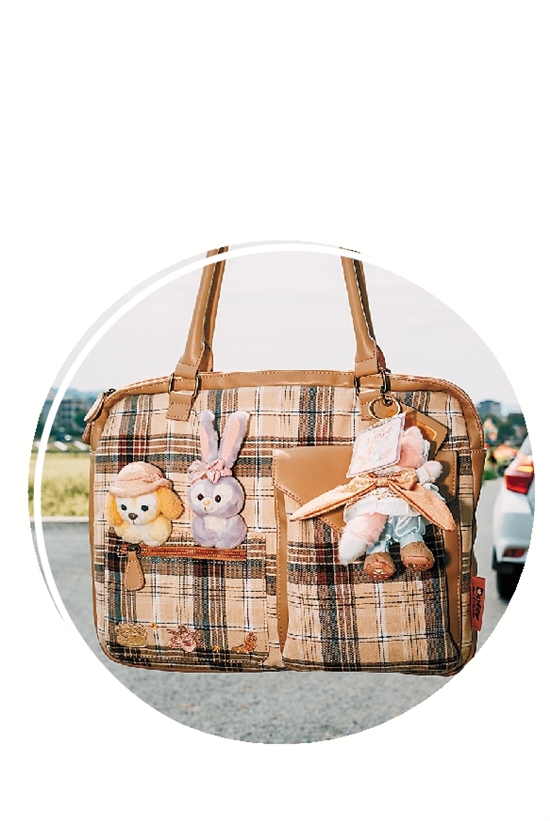 恰到好处的配饰可以让整体造型更显完整。模特身上挎着的棕黄格纹通勤包与整体色调相呼应,格纹元素也延续了复古基调。多口袋设计兼具实用性与美观度,日常出行可轻松收纳随身物品。包上点缀的玩偶挂件更为整套穿搭注入几分俏皮元气,让造型更具记忆点。