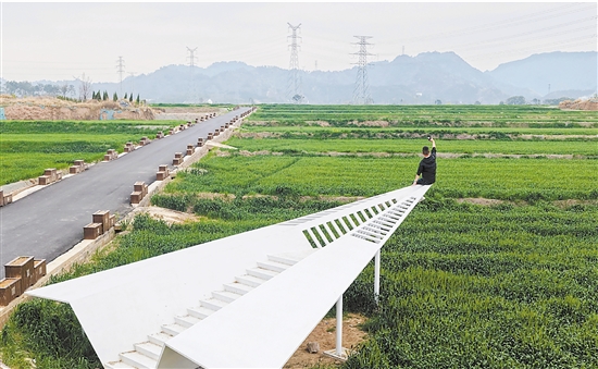 连日来,在万亩方项目现场,麦苗随风轻轻摇曳,尽显蓬勃生机。麦田中,在一座以纸飞机为造型的观景台上,游客用手机定格春日田园美景。 融媒记者 胡东来 摄