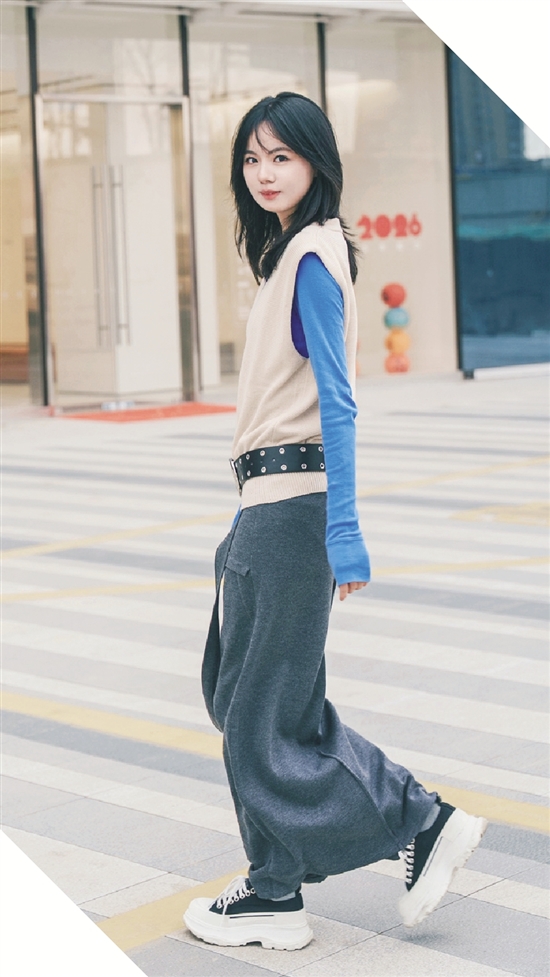 下半身则选用了一条垂坠感十足的深灰色长裙。宽版铆钉皮带外扎于背心下摆,利落地拉高了腰线。裙身的飘带随步伐轻晃,为整体造型增添了随性感。