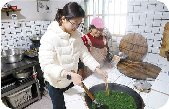 随后,吕爱兰将洗净的艾草放入沸水锅中,边煮边提醒记者:“焯水时加少许小苏打,既能去掉艾草的苦涩味,又能锁住天然的翠绿色,煮出来的青汁才好看。”