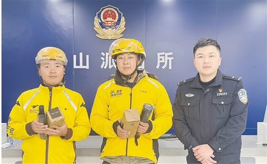 外卖小哥王国成(左一)、周江平(中)、民警陈龙祥(右一)