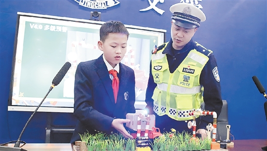 活动中,学生陈奕铭成了全场的焦点——他带着自己荣获浙江省青少年科技创新大赛一等奖的作品“限高杆自动报警器”,为交警和同学们讲解了作品的创作理念、制作原理以及运行方式。