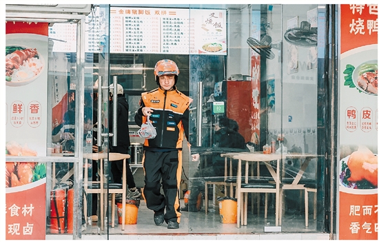 石玉翱的生活简单而专注,常年穿梭在芝英街巷,熟悉这里的每一处“毛细血管”,也与同行、店家相谈甚欢。乡间外卖配送不同于城市,不仅路途遥远,还常遇复杂路况与冷门定位。蜿蜒的小路、错落的老居民楼、喧嚣的厂房与商业街,都有他奔波的身影。每一次穿梭,都书写着他与生活并肩前行的坚韧。