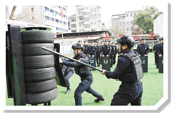 从“单兵尖刀”到“一组多用”升级。最小作战单元4人处置小组训练中,针对室内室外不同警情环境,重点演练作战单元的队形变换、装备运用与战术协同,灵活运用盾、叉、棍组合编配,实现快速妥善处置。
