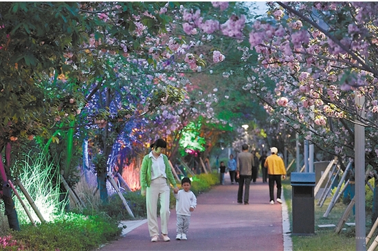 4月6日,江南街道白垤里村附近绿道上,晚樱盛放,灯影如梦似幻。市民漫步其间,或拍照留影,或悠然散步,在花香与光影中尽享春夜惬意时光。