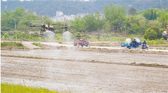 4月8日,在象珠镇山西村附近的稻田里,一架植保无人机低空盘旋、平稳运作,对稻田开展喷雾作业。伴随着螺旋桨的轰鸣声,细密的药雾均匀洒落田间,科技赋能让传统农耕焕发新的生机。 融媒记者 杨成栋 摄