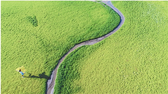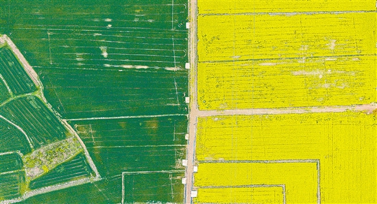 镜头之下,大地仿佛被大自然打翻了调色盘——金黄的油菜花田与翠绿的麦田交错铺展,宛若一幅绚丽的油画;蜿蜒的江水穿城而过,两岸新绿叠翠;城镇与村落掩映在花海之间,处处焕发着蓬勃生机。