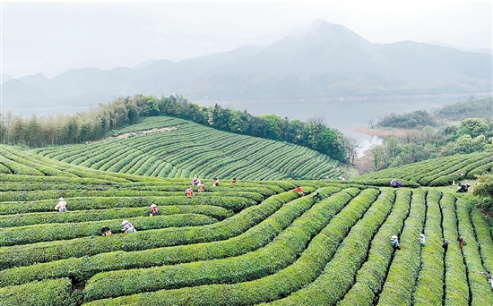 正值春茶采摘季,各地茶农抢抓晴好天气采摘茶叶,供应市场。图为4月10日,茶农在浙江省湖州市德清县莫干山镇北湖村生态茶园采摘春茶。