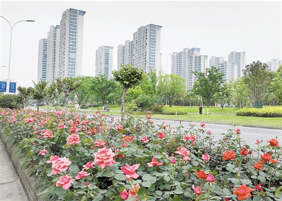 4月13日,溪心路上,五金大道和丽州南路路段公路中央的绿化带里,月季花正迎着春风肆意盛放。道路两旁绿树环绕,高楼林立,繁花、绿意与建筑交织,构成一幅鲜活的春日画卷。